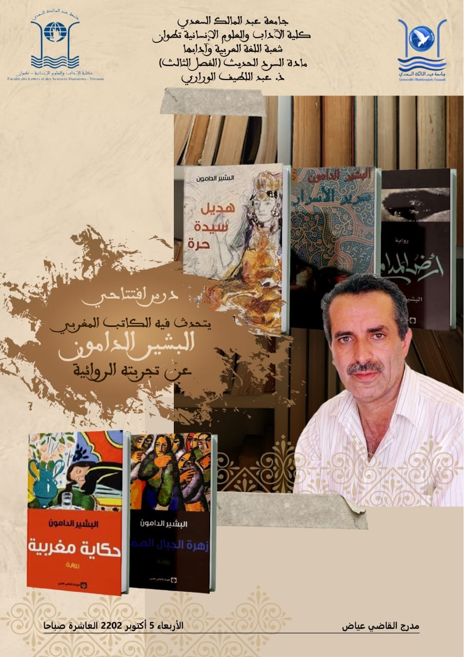 شهد مدرج القاضي عياض يوم 05 أكتوبر 2022، في رحاب كلية الآداب والعلوم الإنسانية، درسا افتتاحيا في مادة (السرد الحديث) للروائي البشير الدامون، لفائدة طلبة الفصل الثالث. وقد أشرف على الدرس وأطّره أستاذ المادة د. عبداللطيف الوراري الذي قدّم الروائي البشير الدامون إلى الطلبة، وعرّف بقيمة تجربته الروائية وغناها النصي والتخييلي، ثم أعطيت الكلمة للروائي البشير الدامون الذي استعاد شذرات من مساره التكويني والجامعي، ثم تكلم عن كل رواية من رواياته الخمس على حدة، قبل أن يُفتح الحوار معه من طرف الطلبة الذين تفاعلوا مع الدرس وأغنوه بتساؤلاتهم وآرائهم.
